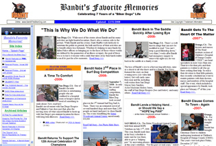 California, and as far away as Nevada and Arizona." "But even a tough little biker dog has a soft side and a very large heart. One of my favorite activities (and something very close to my heart) is attending fund raising events throughout San Diego, Orange and Los Angeles Counties. Those most special to me are the events that support local Humane Societies and Animal Shelters, supporting Children's Hospitals and bringing joy to those precious children along with visiting the people in the San Diego Hospice. Also, I enjoy supporting the heroes in my community: the Police and Firefighters. These are people who go out and risk their own lives every day for each one of us, usually people they have never met or known. Sometimes in the course of their work tragedy strikes, taking them from their families and loved ones. They, as well as their families, need our support." Bandit passed away December 19, 2008 from brain cancer. May he rest in peace.